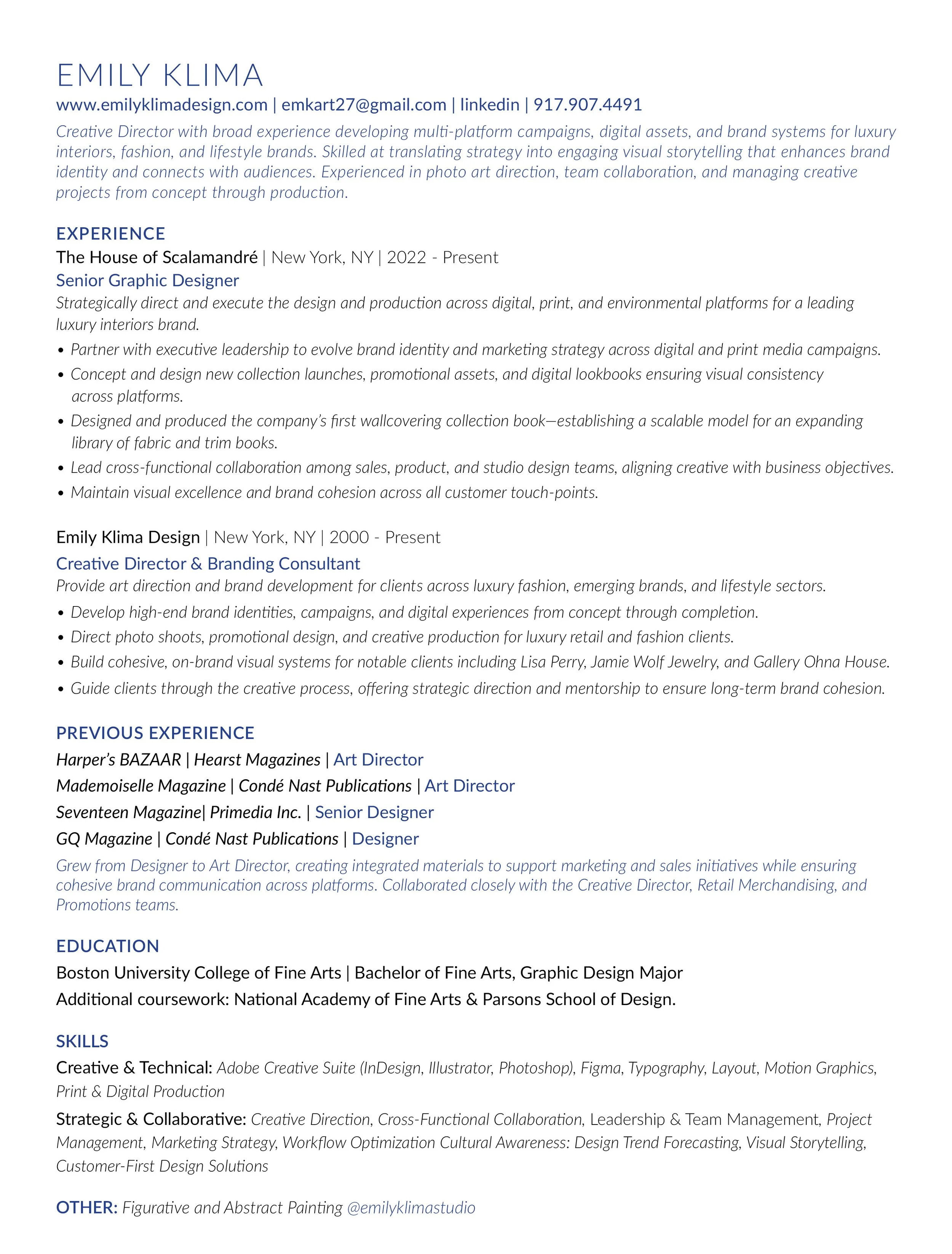 Emily M. Klima is a New York City–based graphic designer and visual artist. She is currently a lead marketing creative at The House of Scalamandré and has also run her own independent design business, following a decade of design and art direction at Condé Nast Publications and Hearst Magazines.